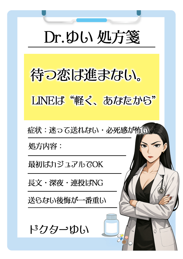 | 連投・催促 | しつこい男認定 | 1日待つ、ダメなら別話題で軽く送る |