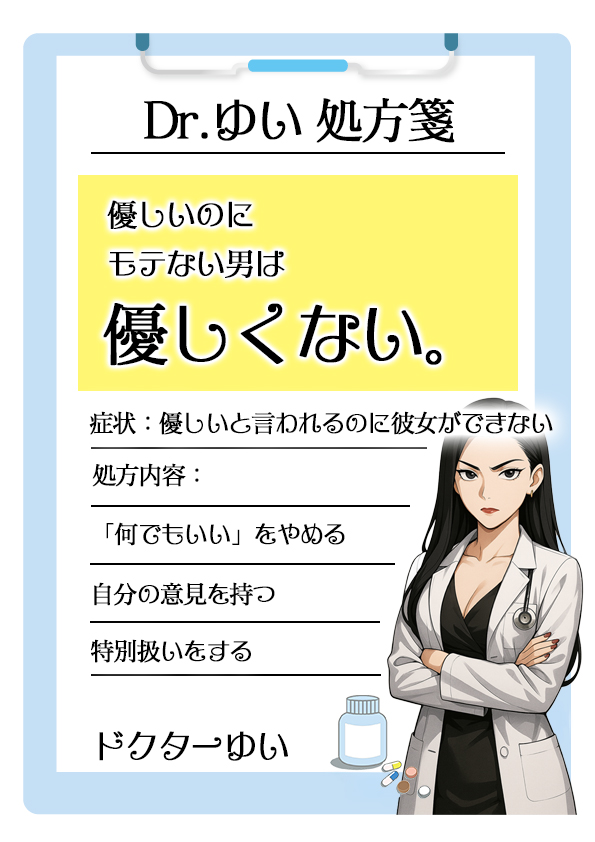 だから、優しいけど付き合おうとは思わない、優しいけど彼氏にしたいとは思えない…と、多くの女性に感じられてしまうんですよ。