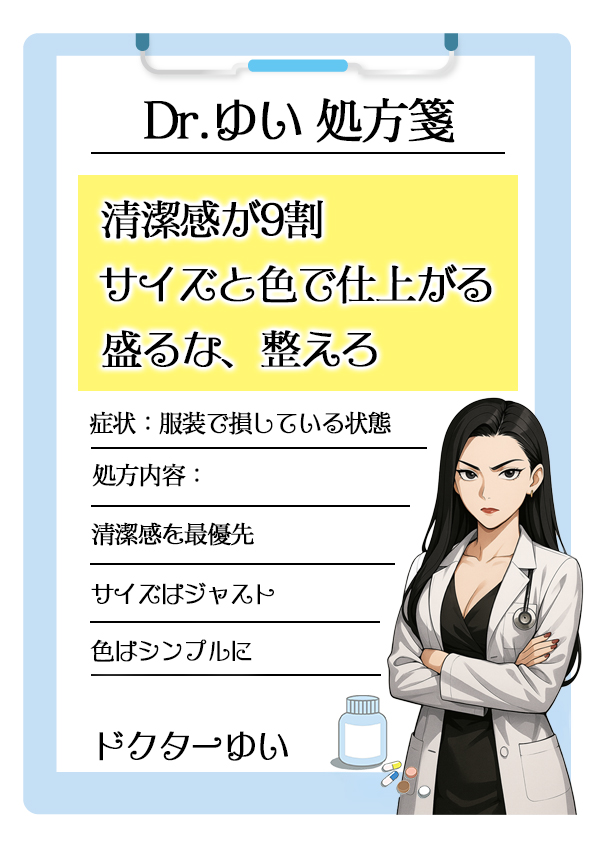 - 清潔感・サイズ感・色のバランスを整え、シンプルな装いで好印象を狙うべし