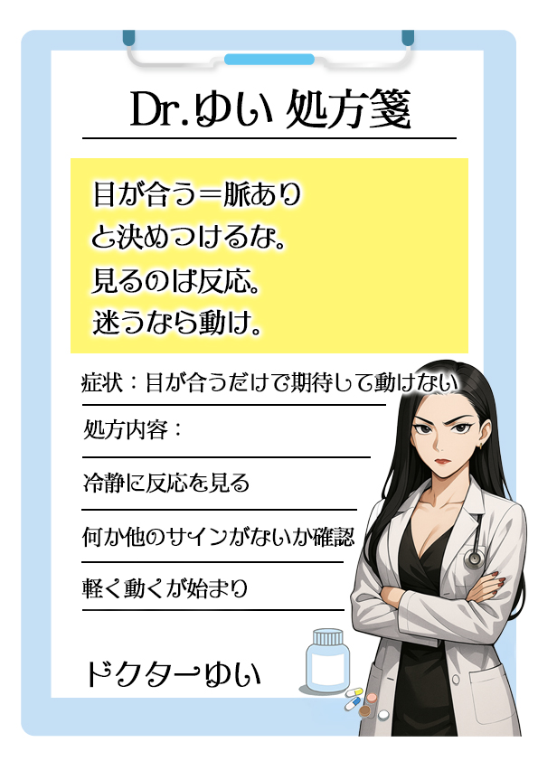 - 目が合ったという事実だけに浮かれるのではなく、状況を全体的に見て脈の有無を考える必要あり